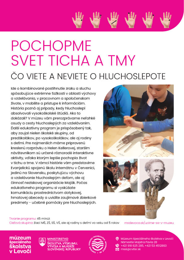 Aj tento program je prispôsobený tak, aby zaujal aj nášho najmladšieho návštevníka, preto si s najmenšími pozrieme rozprávku o Helen Kellerovej, šikovnej a silnej žene, ktorá ako malé dieťa prišla o zrak aj sluch. Komunikácia pre ňu bola spočiatku ťažká, ba až nemožná, keďže Helen nepočula, nerozprávala ani nevidela. Žila v tichu a tme, avšak prišiel deň, keď sa stretla so slovami. Slová boli vyhmatávané do jej dlaní. Vďaka dotyku sa naučila komunikovať, a tým otvoriť svoj vnútorný svet a pochopiť ten vonkajší. Ste zvedaví ako sa hluchoslepí dorozumievajú? V múzeu vám predstavíme dotykovú, teda hmatovú abecedu.