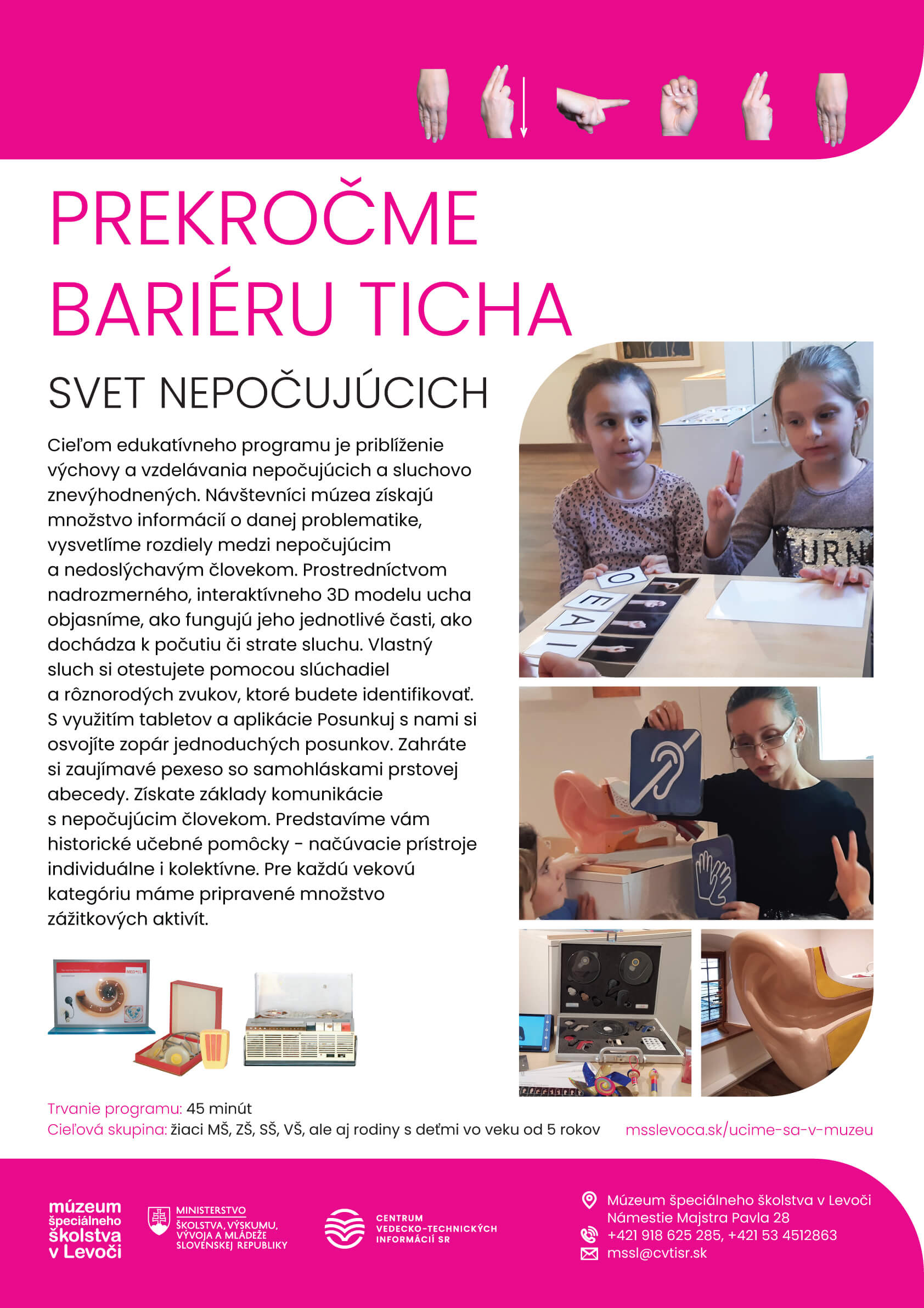 Program je zameraný na priblíženie výchovy a vzdelávania nepočujúcich a sluchovo znevýhodnených. Návštevníci múzea získajú množstvo informácií o problematike sluchového znevýhodnenia. Vysvetlíme napríklad rozdiely medzi nepočujúcim a nedoslýchavým človekom. Predstavíme nadrozmerný, interaktívny 3D model ucha, vysvetlíme ako fungujú jeho jednotlivé časti, ale aj to, ako dochádza k počutiu.