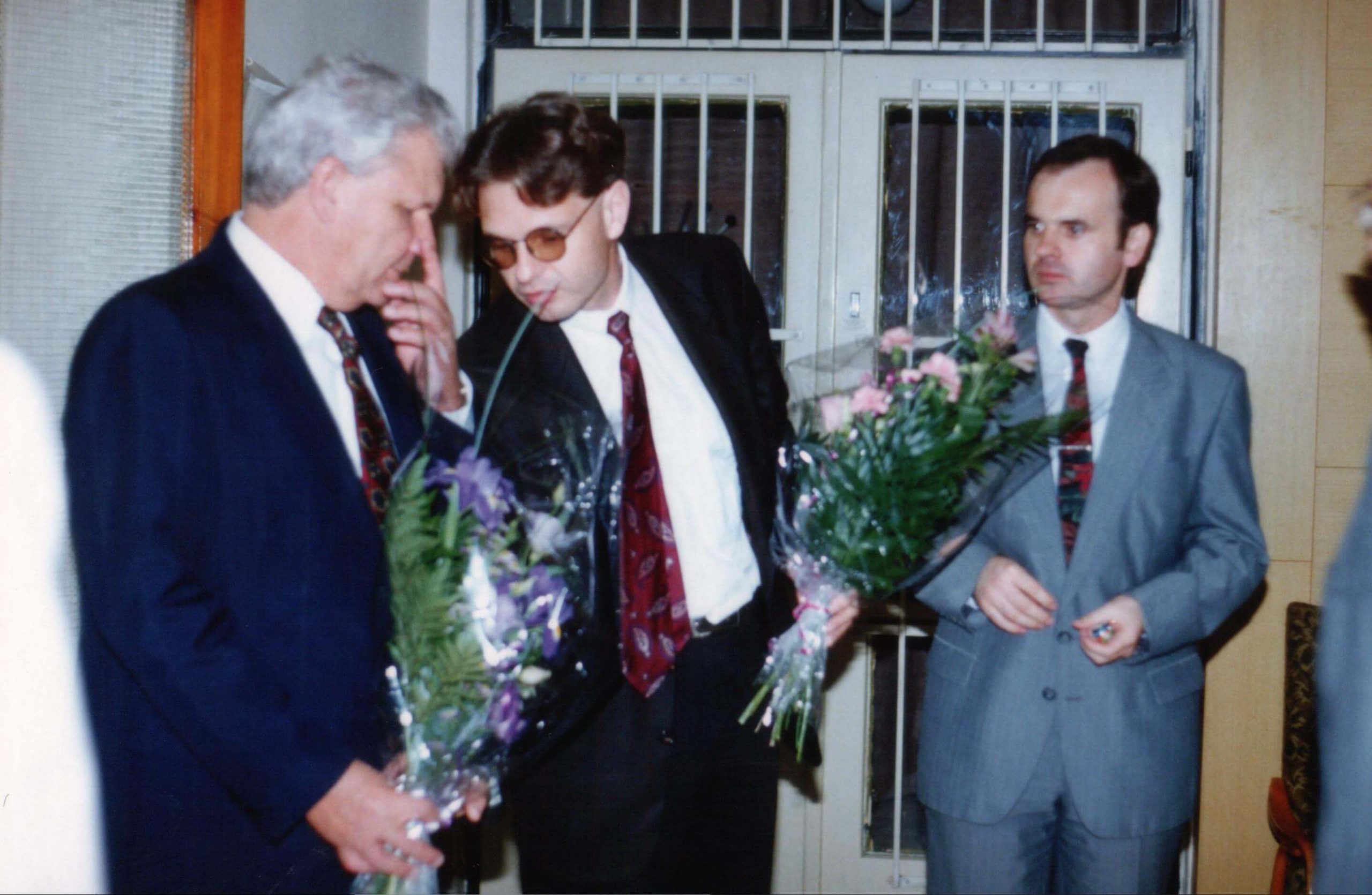 Š. Petreková: Milan Hudeček, autor Eureky A4 (v strede), fotografia z podujatia Tmavomodrý festival v Brne (máj, 1994). Na fotografii M. Hudeček v spoločnosti Davida Blytha, prvého prezidenta organizácie Blind Golf of Australia a Václava Baslika, riaditeľa a klinického logopéda Súkromnej strednej školy pre zrakovo postihnutých v Brne.