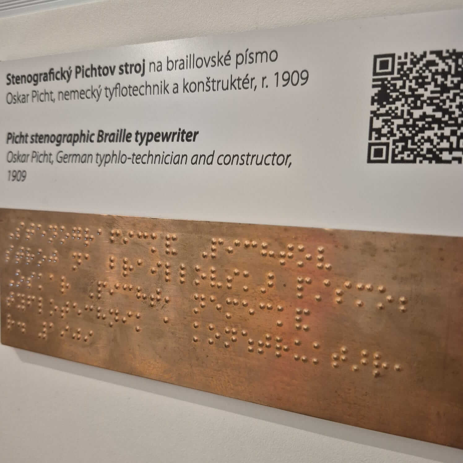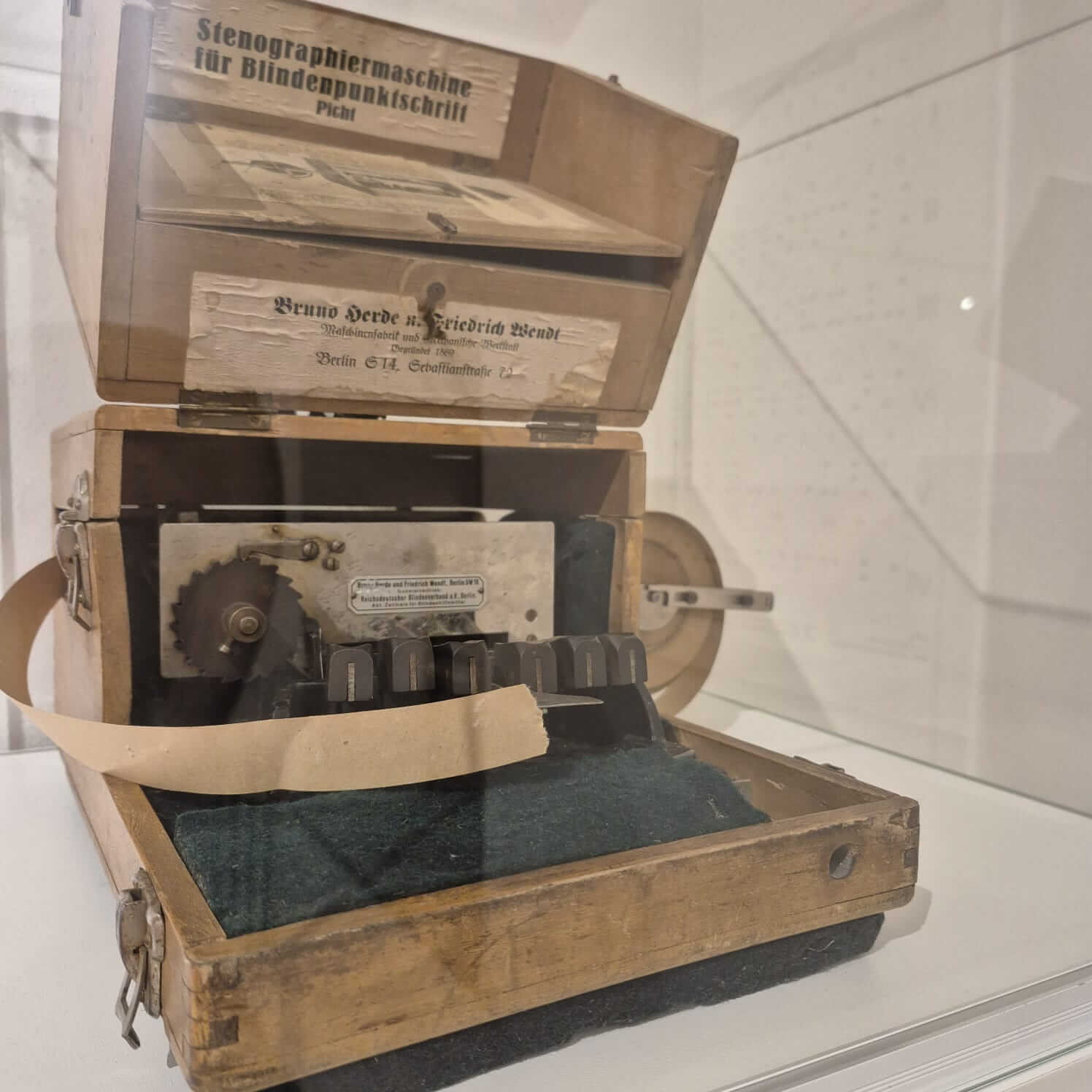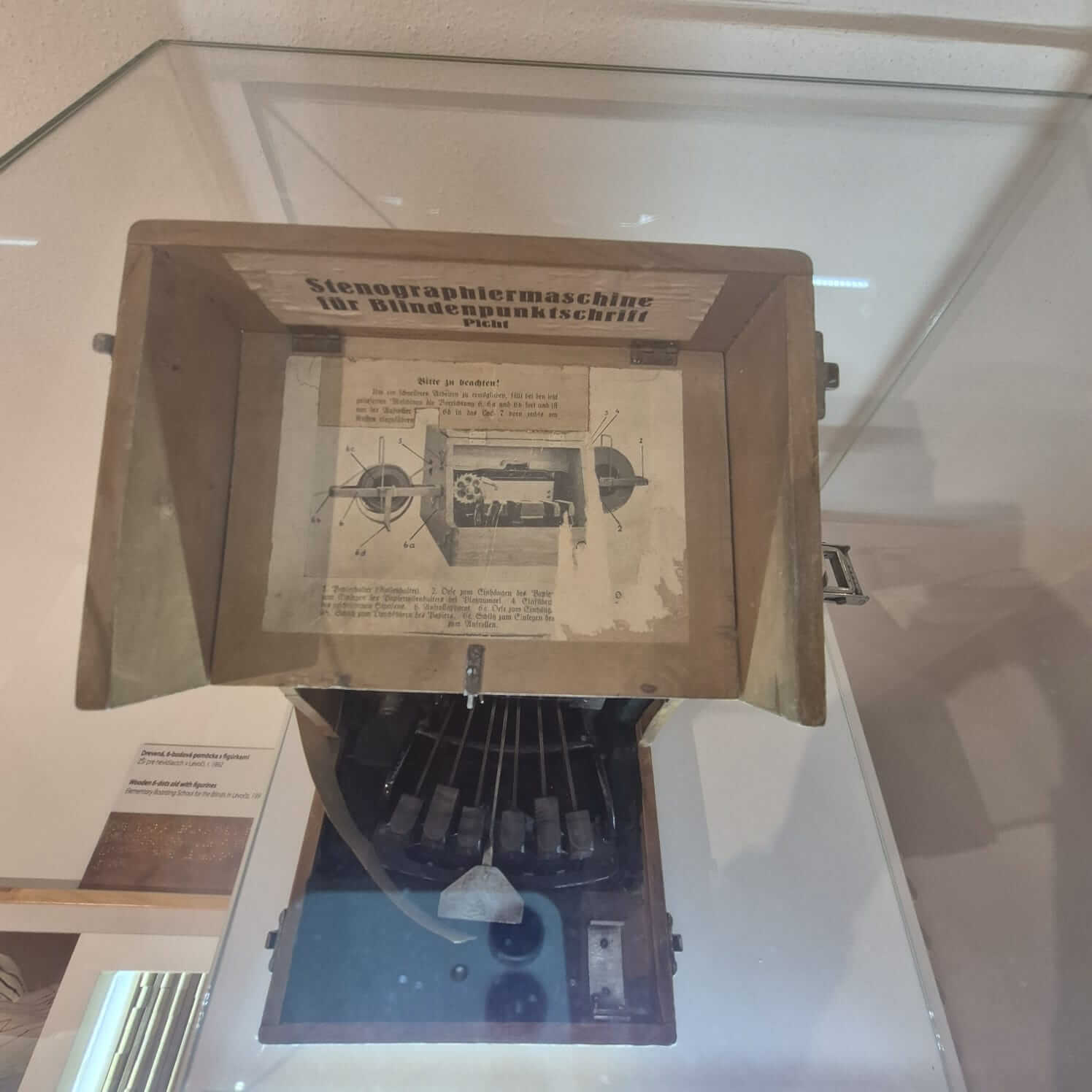 Jedným z nich je aj unikátny stenografický Pichtov písací stroj, ktorý umožnil šikovným nevidiacim rýchlo a úsporne zapisovať informácie v Braillovom písme. Jeho kovové telo je ukryté vo vkusnom drevenom obale, zo spodu upevnené na podložke vystlanej jemným filcom, ktorý mal tlmiť prípadné otrasy pri manipulácii so strojom. Záznam sa zapisoval na pásik papiera, ktorý sa v podobe rolky navíjal na kovový nadstavec na pravej strane zariadenia. Stenograf vyhotovoval záznam pomocou udierania na šesť kláves, ktoré v strede dopĺňala medzera. Podobne, ako na dnešných moderných klávesniciach, predstavovala medzera najväčšiu klávesu. Nastavenie stroja uľahčoval obrazový návod so stručným popisom jednotlivých častí zariadenia a ich funkcie, ktorý je nalepený na drevenom veku kufríka.