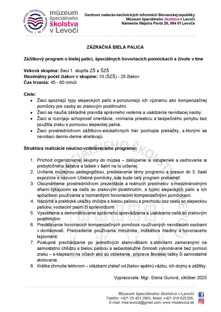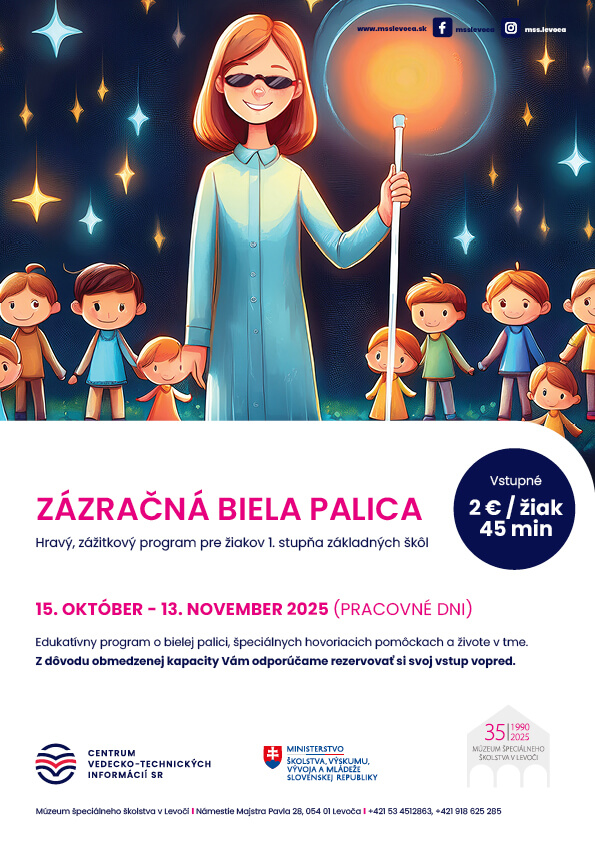 Počas jesene sa celý svet otvára viac smerom k osobám so zrakovým postihnutím a intenzívnejšie sa zamýšľa nad ich každodenným zvládaním bežných alebo aj náročných situácií bez zraku. U nás v múzeu sa v tomto období medzi 15. októbrom (Medzinárodný deň bielej palice) a 13. novembrom (Medzinárodný deň nevidiacich) taktiež dôkladnejšie venujeme zvyšovaniu povedomia o problematike zrakového postihnutia a snažíme sa hravou a interaktívnou formou priblížiť svet nevidiacich aj tým najmenším.